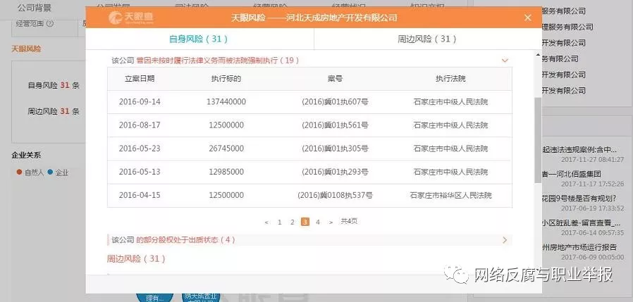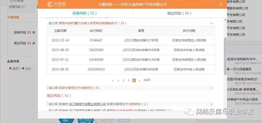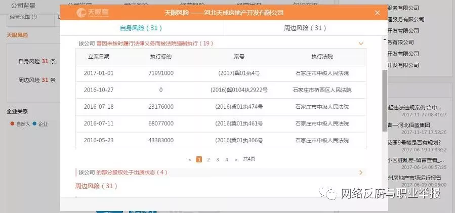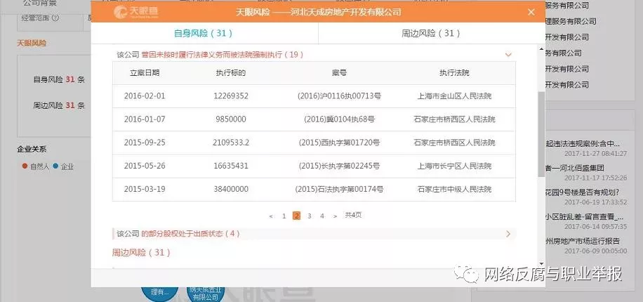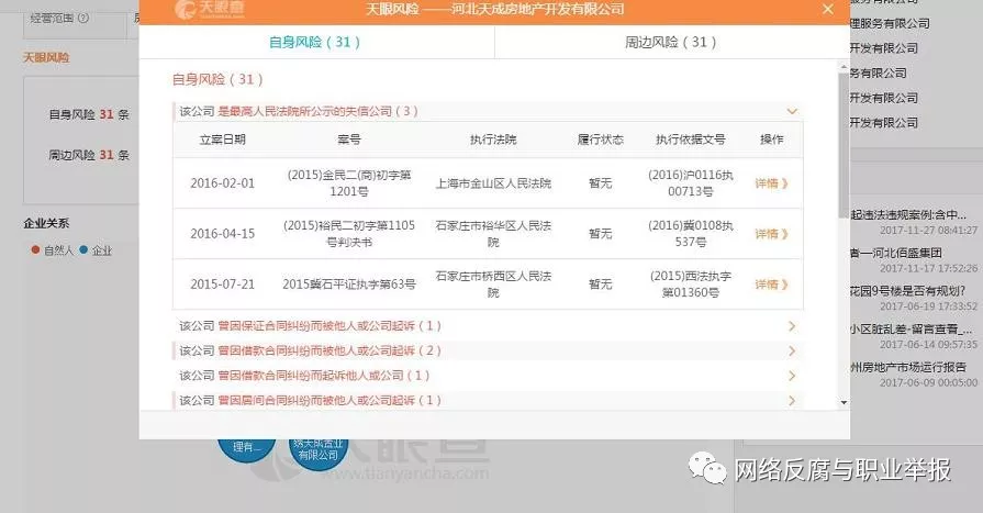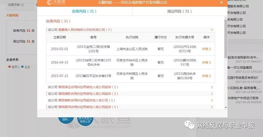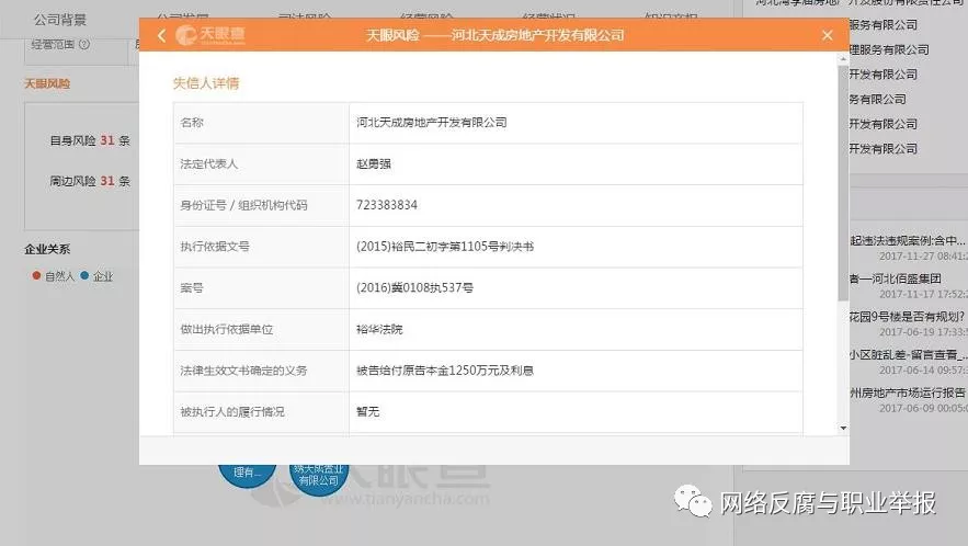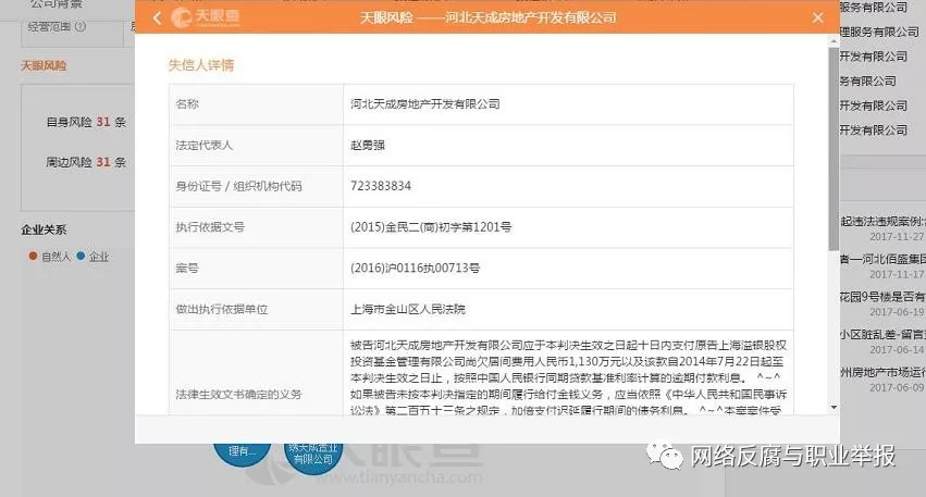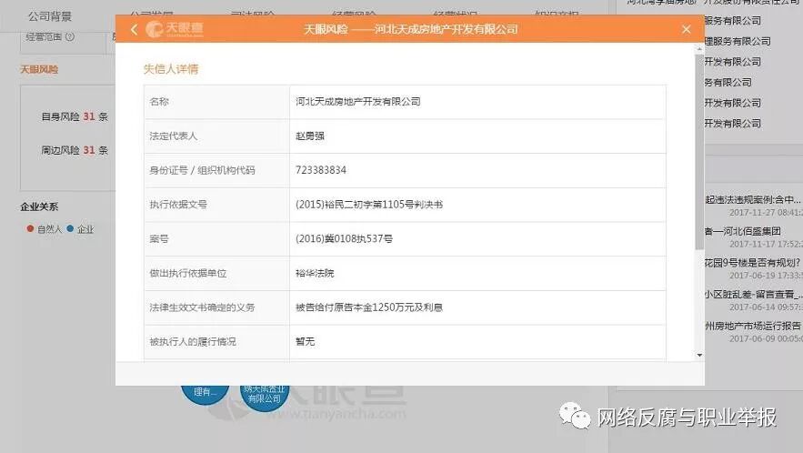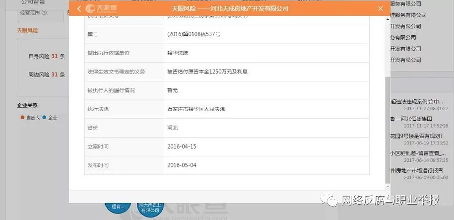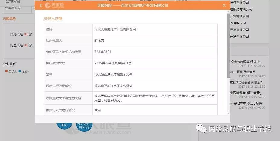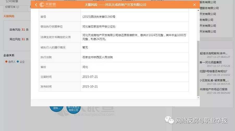 信息还显示,河北天成房地产开发有限公司曾被最高人民法院公示为失信公司3次,执行法院分别为上海市金山区人民法院、石家庄市裕华区人民法院、石家庄市桥西区人民法院。法律生效文书确定的义务为给付原告居间服务费、本金及利息,共计超过3300万元。被执行人履行情况均显示“暂无”。 中国裁判文书网公布的其中一份判决书显示,法院查明,北京某公司于2015年1月15日依约委托某银行石家庄分行向河北天成房地产开发有限公司发放贷款1880万元,而河北天成房地产开发有限公司未能按合同及补充协议的约定按期偿还本息,已构成违约,应承担违约责任。河北省石家庄市中级人民法院判决河北天成房地产开发有限公司于判决生效之日起十日内偿还借款本金人民币1880万元及利息。案件终审份判决书显示,2016年6月12日,河北省高级人民法院对上述案件作出终审判决,维持原判。 近日,有记者联系判决书中北京公司目前的代理律师崔某,其向记者表示,该笔借款本金及利息天成公司至今未偿还。 法院查封房产警方立案侦查? 中国裁判文书网上公示的“2016冀01民初98号案”判决书显示,案件亦为借款纠纷案。该案件中有多名被告,河北天成房地产开发有限公司、赵勇强、赖海波均在列。